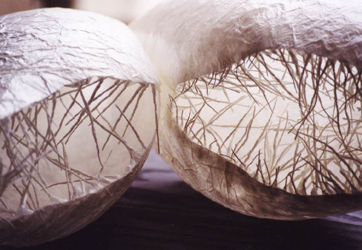 „Die Arbeiten sind extrem leicht und lichtdurchlässig. Ihr Volumen wird durch den Schattenwurf betont, es entstehen minimale Kontraste, die sich fein abstufen und ihre Plastizität beschreiben. Ihre Stabilität erhalten sie durch mehrere Schichten über- und aneinander geklebten Seidenpapiers. Es ist ein Wachstumsprozess, der ihnen organische Lebendigkeit verleiht. Sie sind nicht mehr in Materialität und Zeit eingefroren.“
